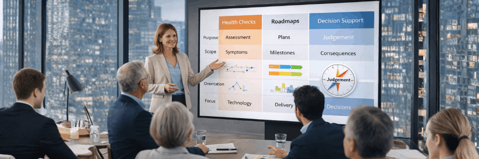 Choose a CRM Health Check when something does not feel right, but you are not yet sure why. This is the right starting point if you are seeing symptoms. Slower delivery, growing support effort, inconsistent data, low confidence in reporting, or repeated rework. A Health Check provides an independent assessment of what is happening across your CRM and Power Platform environment, where the risks are accumulating, and which issues matter most. It is diagnostic, not prescriptive. If the assessment shows that the challenge is primarily about sequencing future investment, a Roadmap will help you decide what to do and in what order. If the issue is a high-stakes decision already in motion, Decision Support provides independent judgement to help you make the right call.